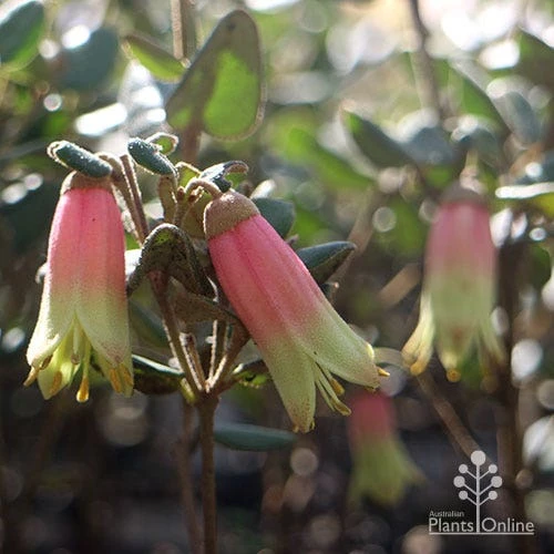 DESCRIPTION: Native flowering shrub with small oval dark green leaves; small bell-shaped flowers from spring to autumn, each peach-pink with a cream-yellow rim.